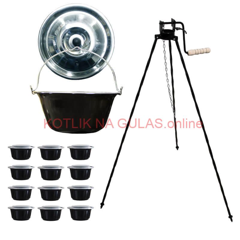 Smaltovaný kotlík 20 L + stojan s kladkou VAR + misky 12 ks